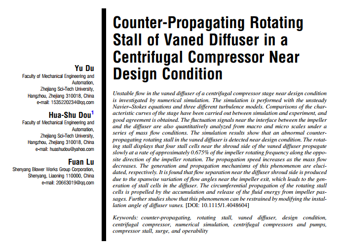 近期,kaiyun开云官网硕士研究生杜昱同学以第一作者身份在国际著名期刊《ASME Journal of Turbomachinery》发表长达19页(双栏)的研究论文,论文题目Counter-Propagating Rotating Stall of Vaned Diffuser in a Centrifugal Compressor Near Design Condition(离心压缩机近设计工况叶片扩压器的反向传播旋转失速),通讯作者为导师窦华书教授。