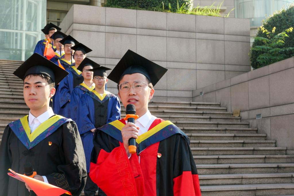 毕业生党员代表徐灵敏、全振潭等人在大会上向党旗报告,汇报了自己深造、就业等情况,他们中有人继续坚守科研阵地,在专业技术创新领域攻读博士后,有人进入研究生支教团为西部建设贡献力量,有人加入了基层公务员的队伍,立志以实干履行职责与使命。他们是广大机控学子勇担新时代使命的有力诠释,也是为服务国家、人民贡献力量的生动写照。随后由支部书记为新发展毕业生党员佩戴了党员徽章,并与大家一起在党旗前庄严宣誓,重忆入党初心。
