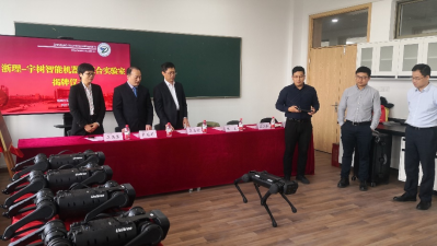 苏志俭代表学院对陈立一行的到来表示热烈欢迎,感谢宇数科技支持学院人才培养工作、共建联合实验室。随后,苏志俭和陈立共同为“浙理-宇树智能机器人联合实验室”揭牌。陈立代表宇树科技向实验室捐赠了“AlienGo”四足机器人一台并进行了现场演示。