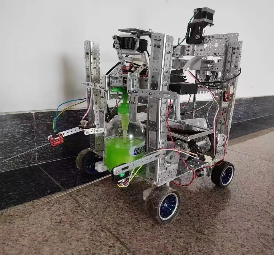 目前全球疫情形势严峻,针对各种场合的防疫设备和措施的优化尤为重要,现有技术主要针对于公共场合的防疫且无服务功能,为了针对较为封闭的家庭空间和实现外界带回病毒的有效清除,设计出一款消毒服务一体化的家居防疫机器人。主要功能有自动避障功能、多方位自动消毒功能、自动按压洗手液功能、口罩取出功能及测温功能。其中多方位自动消毒功能、测温功能通过蓝牙与手机连接,并在手机上搭建了相应平台。避障功能通过触须模块实现。自动按压洗手液功能与口罩取出功能通过红外感应模块实现。本机器人各个模块间的联系密切,相互配合,整体性强。各传动机构根据其功能选择丝杆传动及履带传动等传动方式,将各个机构联系起来相互配合,且整体结构简单,便于安装和维护。