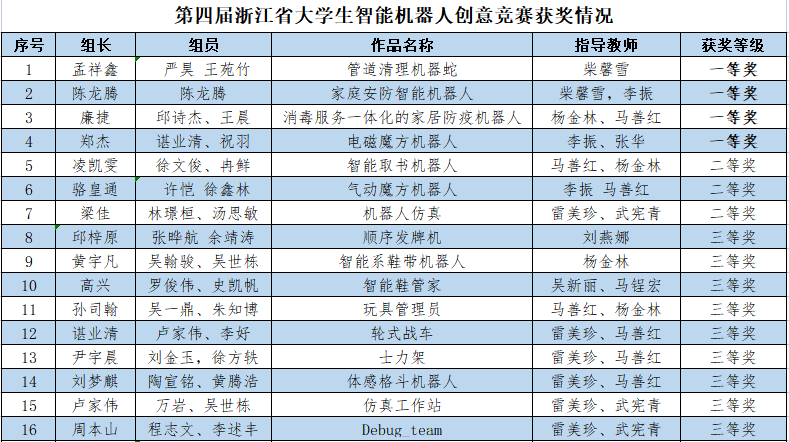 近日,kaiyun开云官网学子在第四届浙江省大学生智能机器人创意竞赛中斩获佳绩,获一等奖4项、二等奖3项、三等奖9项。