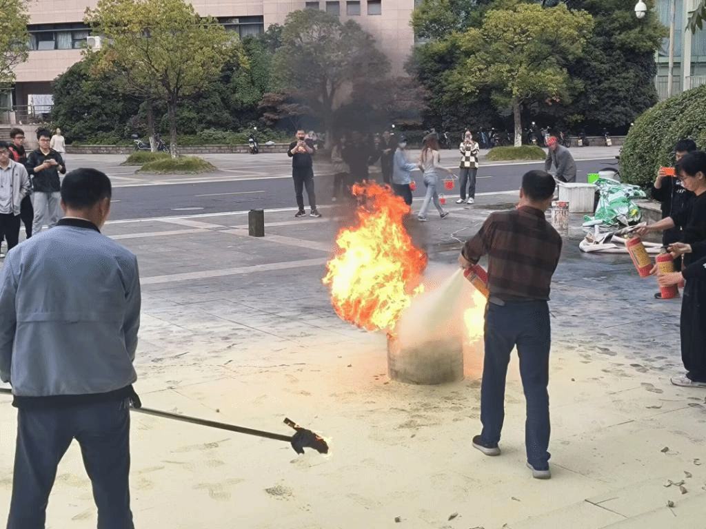 最后,举行了真火消防演练,通过实际的演练来强化大家对于消防知识的印象。大家在李老师的指导下依次进行了灭火的操作,在灭火的过程中同学们有序组队,以三人为一组合力灭火,在此过程中,熟练地掌握了使用灭火器的使用技巧。