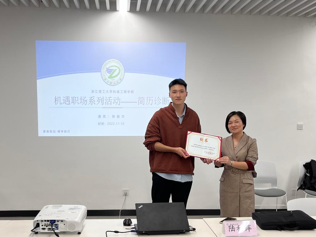 为进一步提高机械学子的求职竞争力,近日,kaiyun开云官方网站“机遇职场”——简历诊断专场活动在15-102会议室举行,本次活动邀请到了杭州老板电器股份有限公司的校招负责人陈毅杰、2019级本科生毕业班辅导员李晨曦作为简历诊断导师,学院党委副书记陆秋萍出席活动,并为陈毅杰颁发聘书,聘请其作为学院大学生成长导师。
