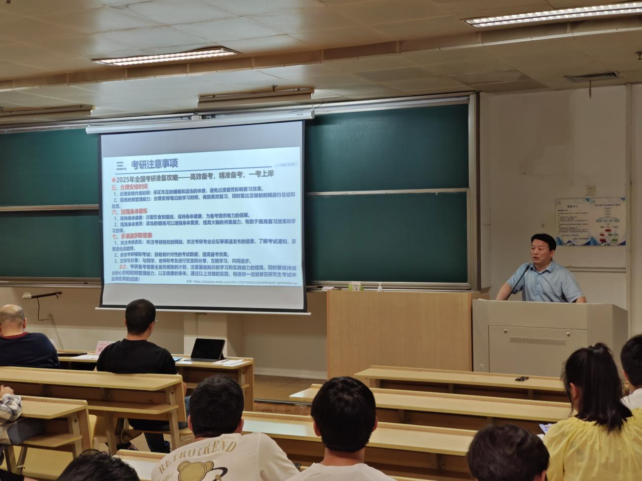 会上,副院长鲁玉军做考研动员讲话。他详细分析了学院近年的考研情况,明确考研是学生提升自身综合素质、增强就业竞争力的重要途径,对于个人成长和职业发展具有重要意义。鲁院长结合时事热点、优秀校友成长事迹生动阐述热爱学术是选择考研的源动力,心有热爱才能久久为功,绵绵用力。通过往年考研数据对比,鲁院长强调扎实基础和过硬能力对决胜考研上岸的必要性,提醒同学们注意备考中的各项事项,如择校择专业、保持身心健康,相信厚积薄发的力量。