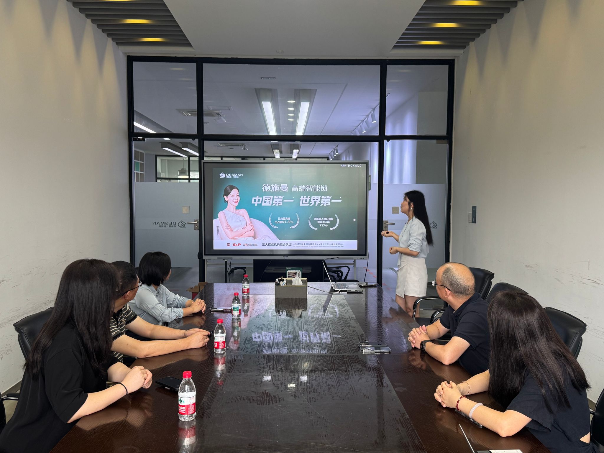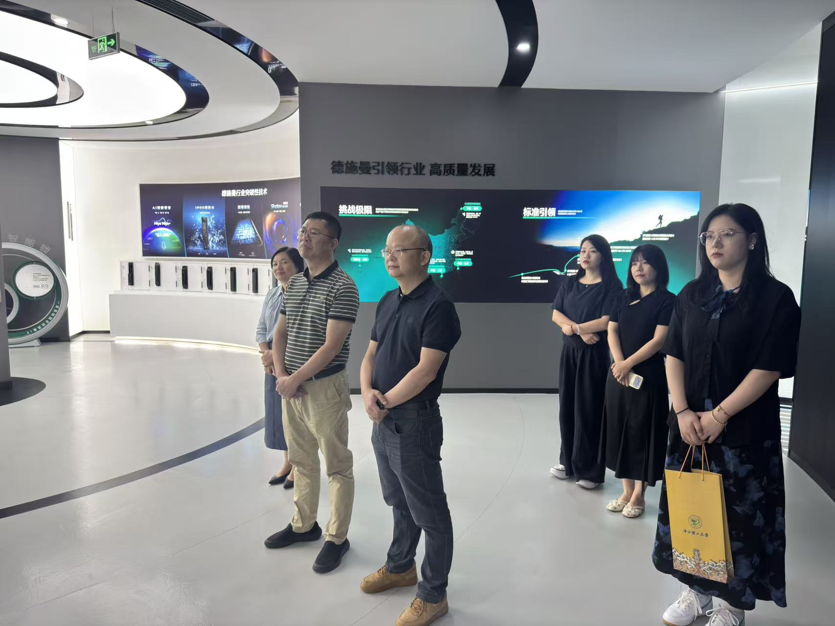 在董启广校友的陪同下,苏志俭一行首先参观了企业品牌大厅。通过沉浸式展示与技术讲解,团队深入了解了德施曼专注于高端智能锁产品的自主研发与制造的发展历程——自2009年创立以来,企业秉承 “用科技让生活更简单” 的使命,已成长为集研发、制造、销售于一体的全产业链龙头企业,连续十三年稳居全国智能锁销量前列。展厅内,从首创带屏智能锁开启人机交互时代,到3D人脸锁、AI虹膜锁等颠覆性产品引领行业革新,200多项专利技术的陈列,生动印证了企业 “严谨创新、追求极致” 的发展理念。